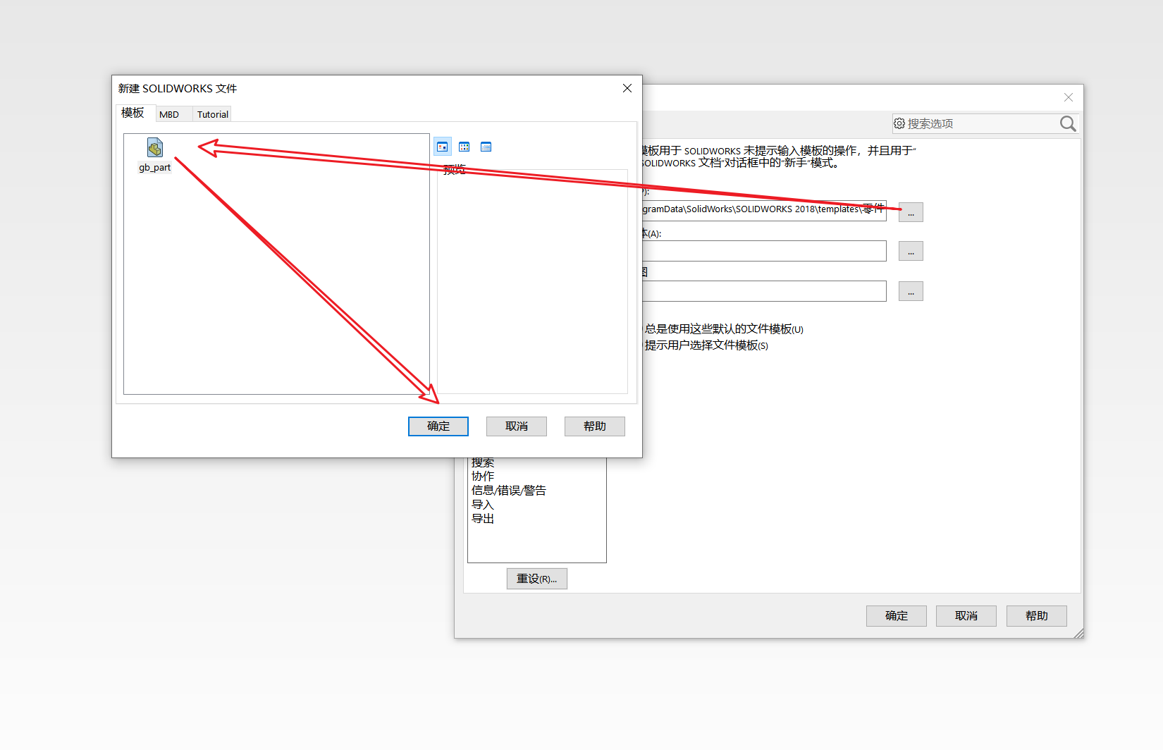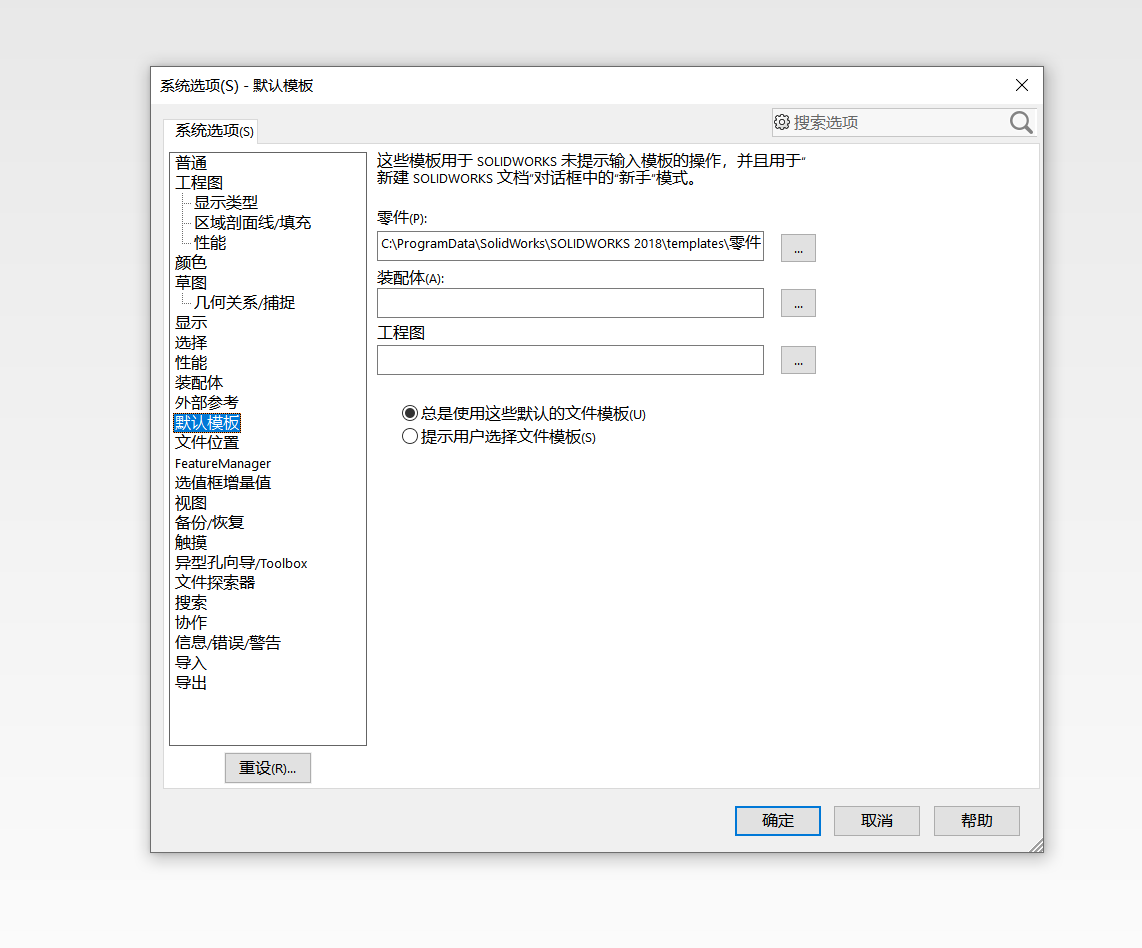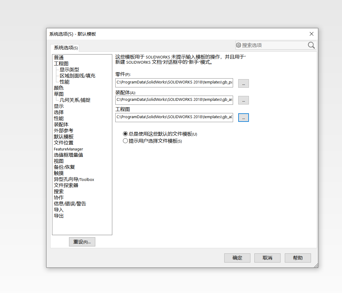 系统选项-默认模板页面中【零件】、【装配体】、【工程图】依次选择默认的模板文件